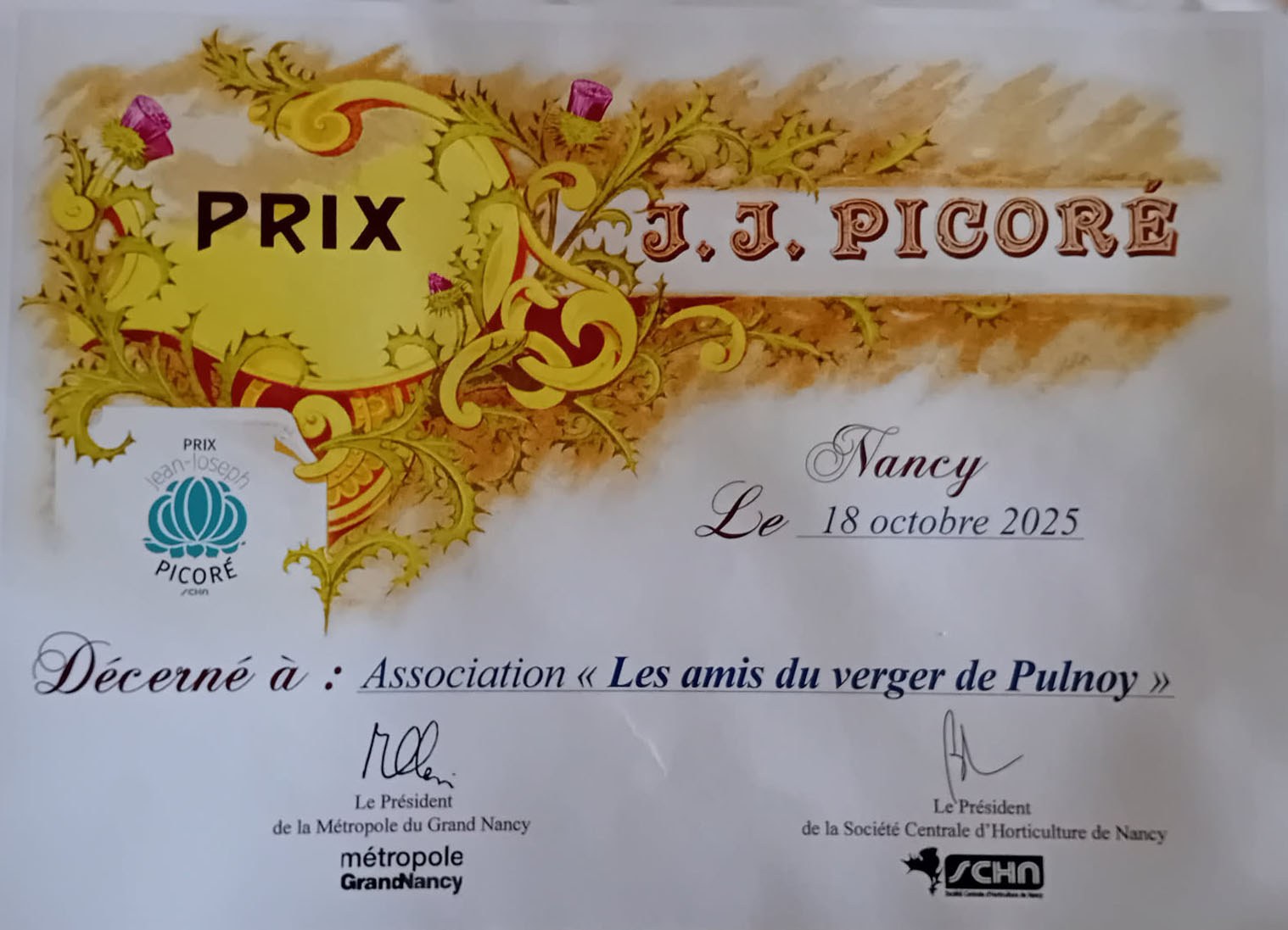 Le 18 octobre 2025 restera un jour mémorable pour notre association. C’est effectivement ce jour que nous avons reçu le prix Jean-Joseph Picoré. Cette distinction est attribuée par l’éminente Société centrale d’horticulture de Nancy (SCHN) qui a été créée en 1877 par Jean Joseph Picoré, horticulteur renommé. La remise a eu lieu au jardin botanique de Vandoeuvre en présence de nombreux présidents d’’associations et de nombreuses personnalités et des maires de Nancy et de Metz ainsi que Marc Ogier notre maire.